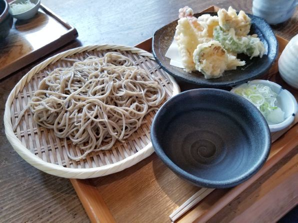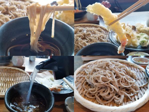 さて午後1時に暖簾をくぐると、店内はそこそこ混み合っています、、、それもそのはず、「あ庵」さんはミシュランのビブグルマンに選ばれた、本格手打蕎麦のお店ですから。。。我々は空いていたテーブル席に案内され、私は"天せいろ"を、、、家内は"桜えびぶっかけ"をお願いしました。。。混んでいるので待つこと約20分、、、注文のできあがりです。。。