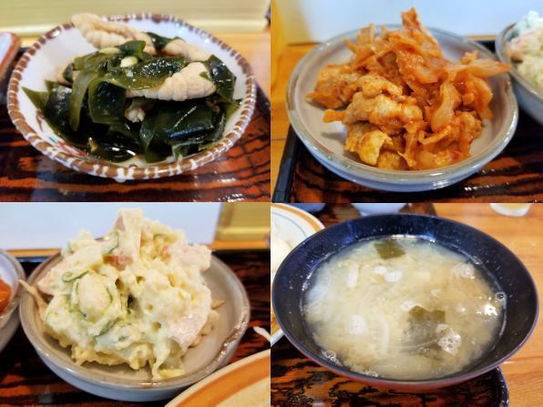 [ナゴヤ ワカメ酢物、豚キムチ炒め、ポテトサラダ、味噌汁]