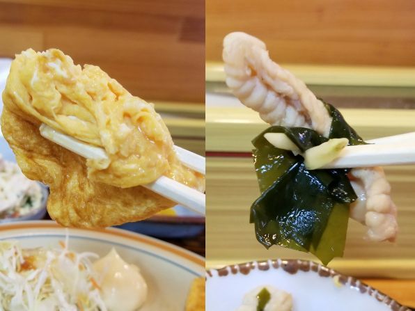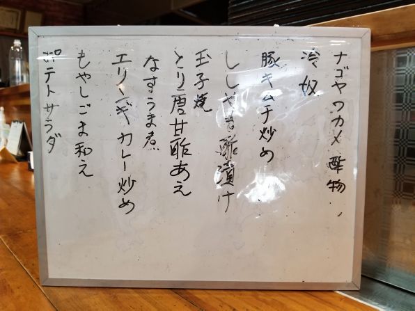 午後1時25分頃の遅い時間に暖簾をくぐると、店内にお客さんはいませんでした、、、私はカウンター席に着き、今日は"玉子焼定食"をお願いしました。。。そして定食は小鉢を二つ選べるので"豚キムチ炒め"、"ポテトサラダ"でお願いすると、店主さんが"ナゴヤ ワカメ酢物"もオススメだから、サービスするので食べてみてネ! と付けてくれまました、、、ありがとうございます~~♪
