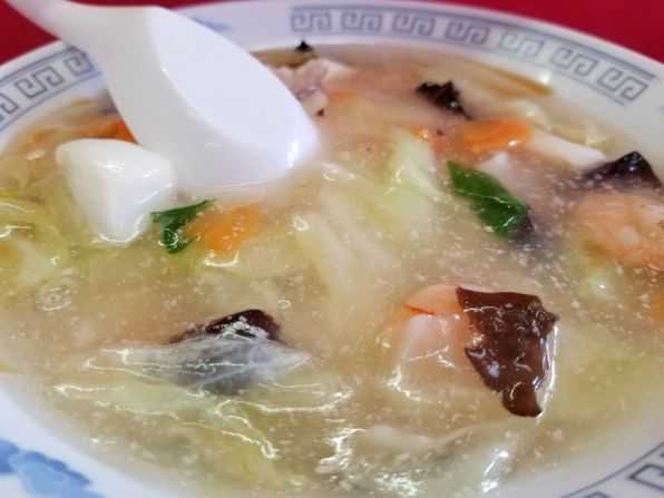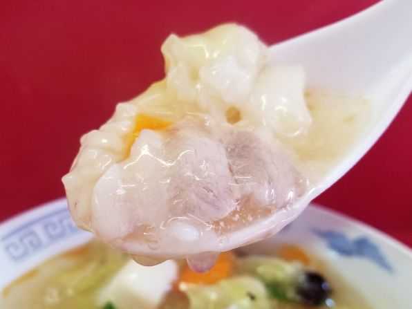 さぁ気になるお味です。。。ご飯の上にかかっている餡は、このお店の塩系豚骨スープの餡でしょう、、、そこに豚肉、イカ、ムキエビ、キャベツ、ニンジン、キクラゲ、ネギが綴じられています。。。一般的な中華ではキャベツでなく白菜ですが、お店の"チャンポン"がキャベツなので、その流用でしょう、、、また 以前 はなかったムキエビが入っていますし、イカも下足の部分ではなくなりました。。。うんうん、旨い旨い~☆