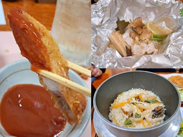 [トンカツをアップ、鯛ホイル蒸し、釜飯]