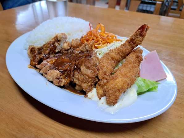 何度もレポしていますが、気になるお味です。。。大皿に盛られているおかずは、デミグラスソースのかかったチキンカツ、エビフライ、スパゲティー、ハムとキャベツ、レタスのサラダです、、、それにライスと福神漬が付いています。。。このチキンが柔らかくてジューシーで私は大好きなのです!!