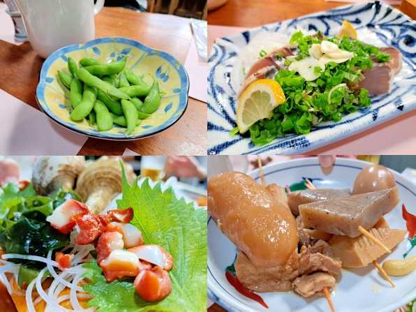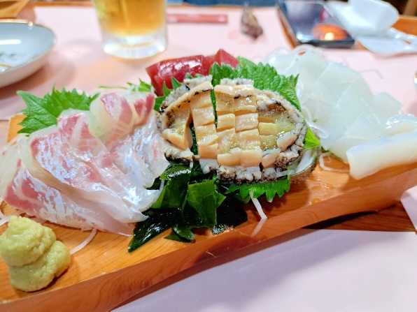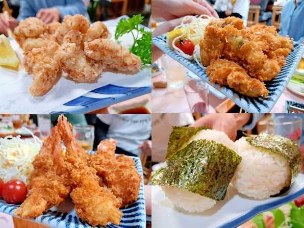 さて料理は豪華にアワビや鯛の刺身から始まりました、、、鰹のタタキやおでんもGOODです!! またミノ唐揚げやカキフライ、エビフライなど揚げ物もタップリ出てきましたねぇ。。。うんうん、旨い旨い~☆