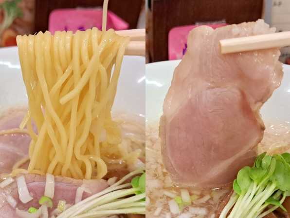 さぁ気になるお味です。。。いつもながら綺麗でこだわった盛りつけで、スープの表面は背脂と白ネギが覆っています、、、そんなスープをまず一口。。。おおぉぉぉ、塩ダレに干し貝柱、乾燥椎茸等の乾物類と、国産海塩4種類をブレンドしたスープはすごく上品、、、そこに甘い背脂がコクを加え、食べるに連れ旨みが増してきます。。。