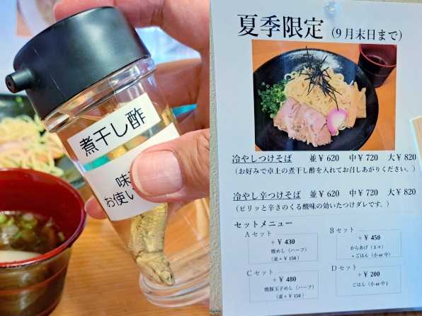 麺を半分食べたあたりで、味変用の煮干し酢をふりふり、、、うんうん、爽やかな酸味と旨みがプラスされました!! うんうん、旨い旨い~☆