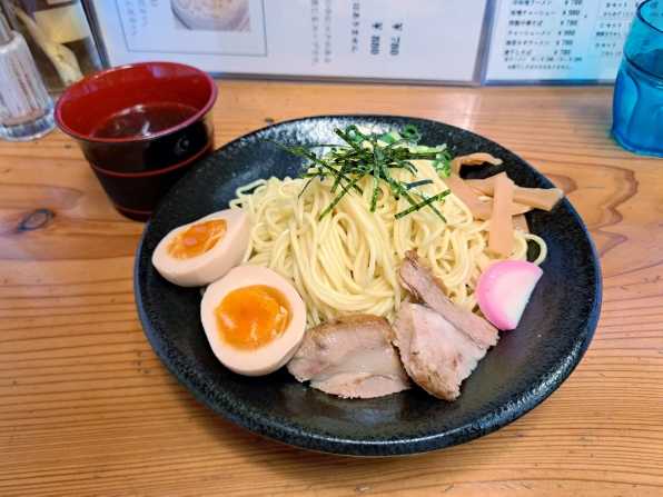 車が少なくなった午後1時15分頃に入店すると、店内には3組のお客さんです、、、私は空いていたいつものカウンター席に着き、迷わず"冷やしつけそば(中)"+"味玉"をお願いしました。。。やがて待つこと約4分、、、注文のできあがりです。。。