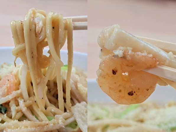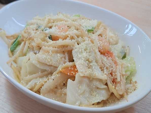 その麺が海鮮や野菜類と炒められ、円やかなバターと、チーズの風味が漂います、、、なんとなくパスタのカルボナーラっぼい感じでしょう。。。なので半分食べたところでブラックペッパーをもらい、追いペッバーで刺激を加えました!! うんうん、旨い旨い~☆