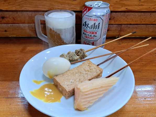 午後8時半頃に入店すると、"おでん"をテイクアウトしているお客さんが一人です、、、私はカウンター席に着き、今回は"ねぎチャーハン"とノンアルビールをお願いし、"おでん"も4本取りました。。。