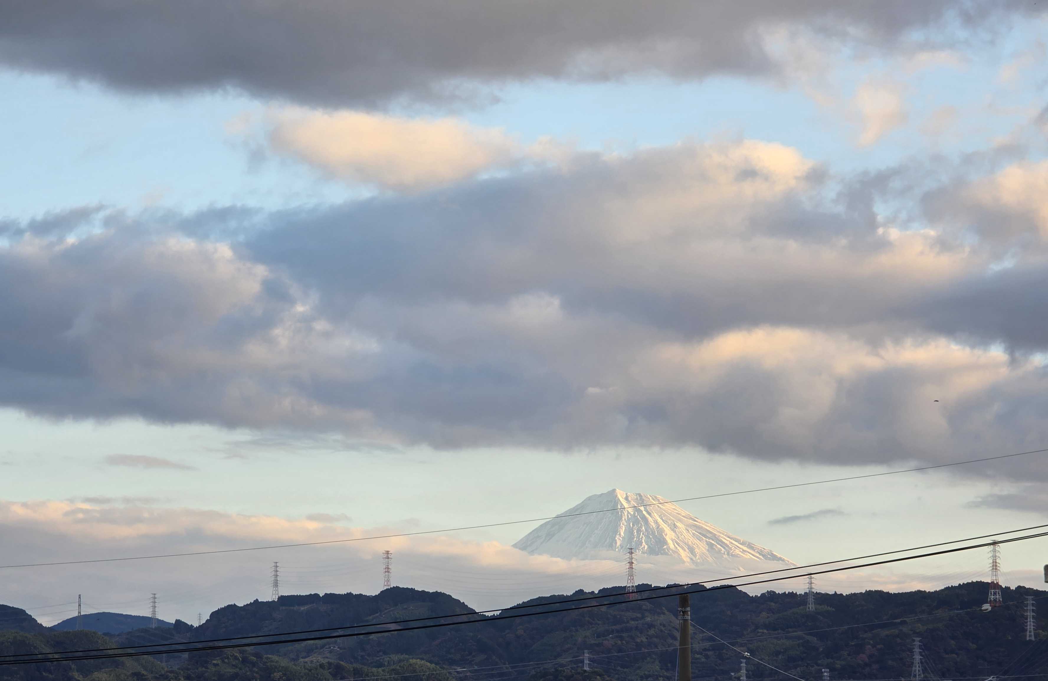 今朝は晴れ 11度 少し雲の多い空で 富士山の三町が 少しずつ見えてきました。