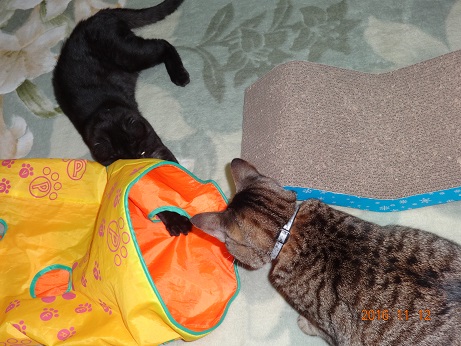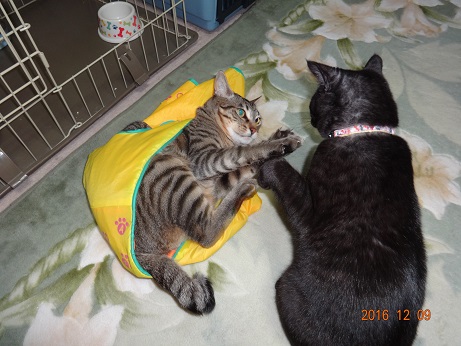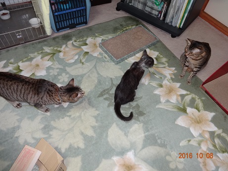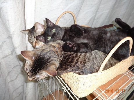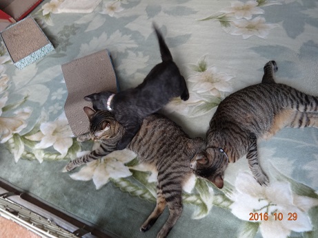 ここ2.3日でクロは兄弟の仲間入り 今ではクロがキロ達に猫パンチしてます キロ達も負けていません、しっかり反撃していました