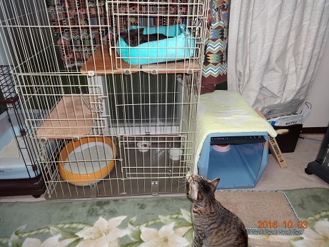 キロとココ性格は反対みたい 餌を食べるにもココはしっかりたっぷり食べるけど キロはゆっくり少しずつ食べる。 クロがいるのでエサはキャリーバッグの中に置いて 扉は下げています(クロが何でも食べようとするので) でもココは左手で扉をあげて隙間から 中に入ることを覚えました。 今日も左手で扉を少し上げたら そこにいたキロが先に中に入って食べました それを見ていた私たちは大笑い・・・・ ココは茫然として見ていたので ますます大笑い ほんとに飽きません!