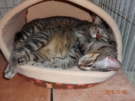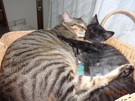 キロココとクロすっかり馴染んで キロ達と同じ格好で寝ています。 時には親子のように毛づくろいしてあげています