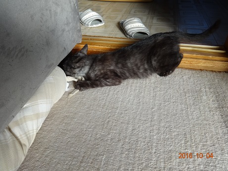 キロは人見知りが激しい、家族以外には顔を見せない 誰か家の中に入ってくると慌ててソファーの下に隠れる 昨日息子が帰ってきたがやっぱり隠れた 息子がエサでつっても食べようとしない 明日帰るまでになつきそうもない 3日以上いなと無理かもね・・・・ クロの人見知りはまだまだ続きそう。
