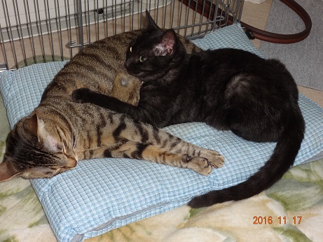 クロは昨日予防接種をしてきた後 少しおとなしかった。 キロはクロのそばにずっと一緒にいて母親みたいでした。