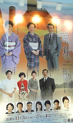 偶然2日連続でマキノ・ノゾミ作品、しかもこっちは演出もやられてます。そして、坂東三津五郎、八千草薫、米倉斉加年、森 光子(国民栄誉賞受賞記念特別出演)という超ベテラン勢出演で、明治座公演!『重責』です!医療ミス問題で悩む主人公の医師のもとに、小学校の先生が突然訪れるところから始まり、話は当時の故郷の話に。昨日の「高き彼物」同様、登場人物は自分の過去の過ちに長い間苦しんだ後、告白し許されるときがきます。この作品も、とっても泣けて感動しました。迷いましたが、観てよかった!!物語は現代と小学生時代に分かれ、坂東三津五郎の父の役を本人が、八千草薫の女先生の若いときを星野真里、森光子の若い時を馬渕英俚可がそれぞれ演じる構成も面白い。ただ、終盤に森光子さんが登場すると、拍手喝采ではありますが、セリフがおぼつかず、劇場全体が凍ったような空気になって、せっかくの芝居の流れ・感動の流れを止めてしまっている感じ。森光子さんは、好きですし、尊敬もしますが、非常に残念でした。↓この二人が目当てです。ただただ、星野真里さん、馬渕英俚可さん目当てで観ましたが、八千草薫さんは素晴らしい演技でした。あったかくて、本当にベテランでやさしい先生です。その若い時を、星野真里さんがストレートにまっすぐに演じています。まさに、当時の清楚な女先生です。そして、馬渕英俚可さんは三津五郎さんの娘の女子大生役。まさに普通の役でしたが、やっぱりそれだけでは終わらない。気の強い母親の若い時を演じて、もうぴったり。強い役が多いですよねぇ。星野真里さん、馬渕英俚可さんののぼりです!時間表。3時間、休憩30分2回の、のべ4時間の大作です。━━━━━━━━━━━━━━━━━━━■ 『晩秋』明治座 ■━━━━━━━━━━━━━━━━━━━作・演出: マキノノゾミ出演: 坂東三津五郎 八千草薫 森 光子(国民栄誉賞受賞記念特別出演)星野真里 馬渕英俚可 中田喜子 米倉斉加年 他http://www.meijiza.co.jp/info/2009/11/main.html━━━━━━━━━━━━━━━━━━━☆人気ブログランキングへ☆↑ランキングに参加してます。↑もし少しでも気に入っていただけましたら、1クリック投票いただけると嬉しいです。m(_ _)m