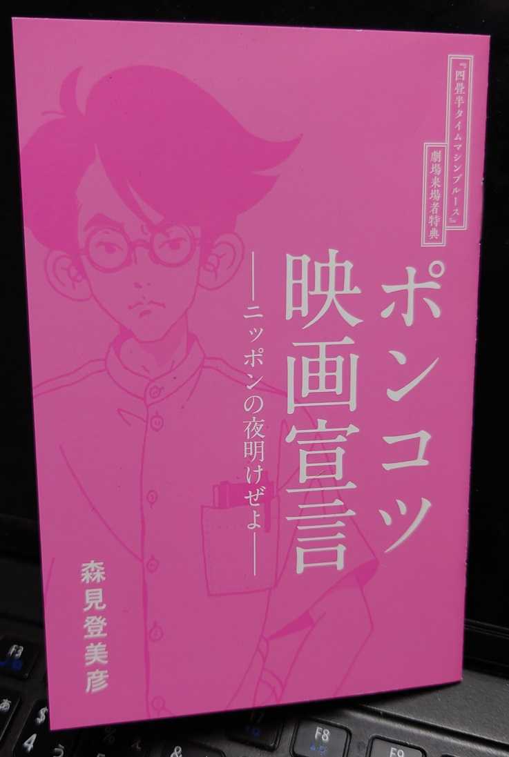 入場者特典・小冊子『ポンコツ映画宣言-日本の夜明けぜよ-森見登美彦』「四畳半タイムマシンブルース」はがきサイズ8ページモノクロ2022.10.9.グランドシネマサンシャインBESTIA enhanced内容は、アニメ登場人物たちによる「映画「幕末軟弱者列伝侍・ウォーズ」完成記念座談会」。原作者による短編で、学園祭の上映回当日に配布するパンフレットの記事という設定。キャラたちのノリが面白いです。四畳半タイムマシンブルース (角川文庫) [ 森見 登美彦 ]価格:704円(税込、送料無料) (2022/10/10時点)楽天で購入四畳半タイムマシンブルース(1) (角川つばさ文庫) [ 森見 登美彦 ]価格:836円(税込、送料無料) (2022/10/10時点)楽天で購入★CD / 大島ミチル / アニメ 四畳半タイムマシンブルース Original Soundtrack / FBAC-171価格:3300円(税込、送料無料) (2022/10/10時点)楽天で購入【期間限定・電子特典付き】 四畳半シリーズ【2冊合本版】 『四畳半神話大系』 『四畳半タイムマシンブルース』【電子書籍】[ 森見 登美彦 ]価格:1148円 (2022/10/10時点)楽天で購入[枚数限定][限定盤]出町柳パラレルユニバース(初回生産限定盤)/ASIAN KUNG-FU GENERATION[CD+Blu-ray]【返品種別A】価格:2129円(税込、送料別) (2022/10/10時点)楽天で購入人気ブログランキングへ