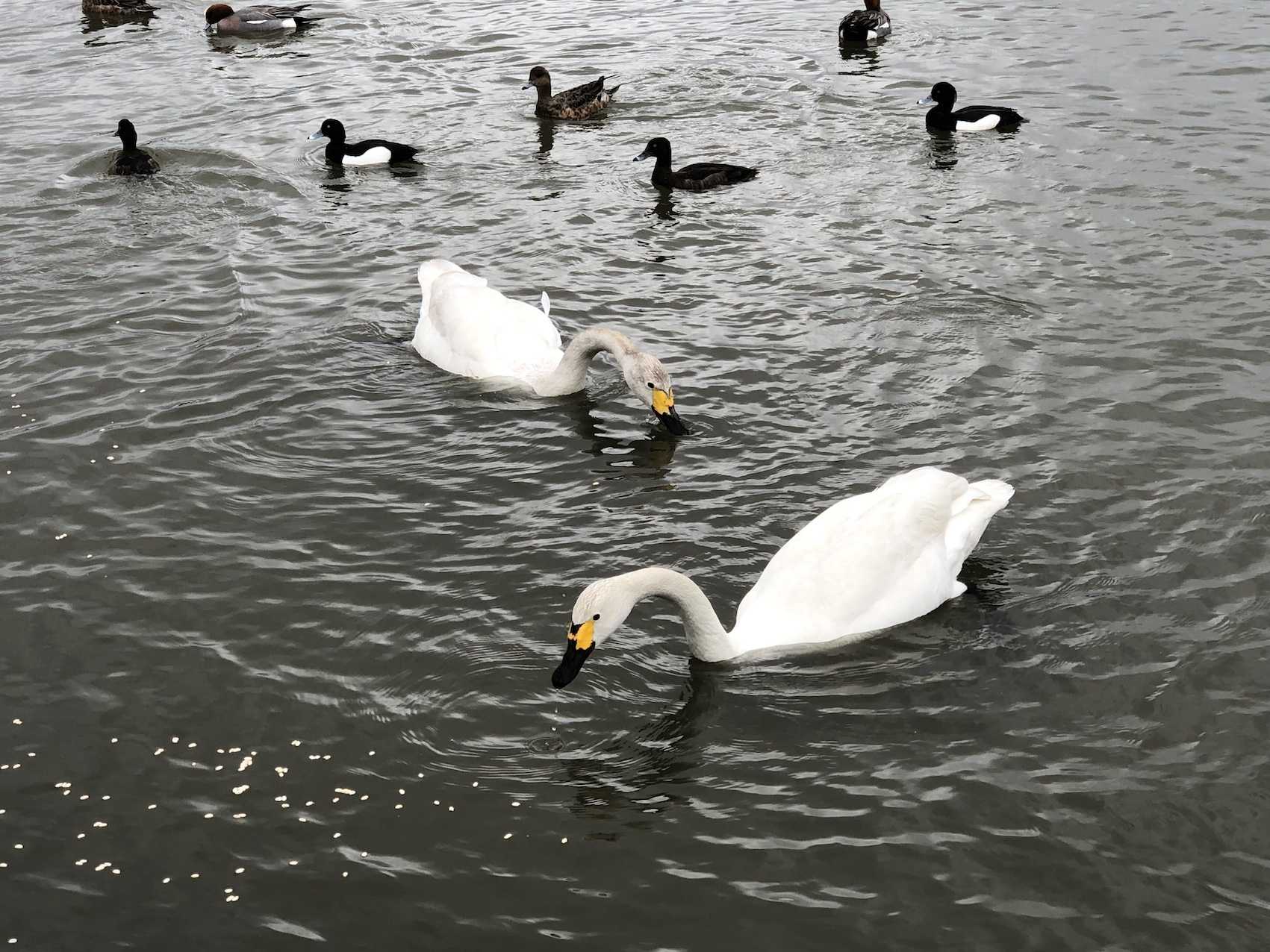 白鳥は昼間近くの田んぼに餌を食べに行くので湖にはあんまりいないそうです