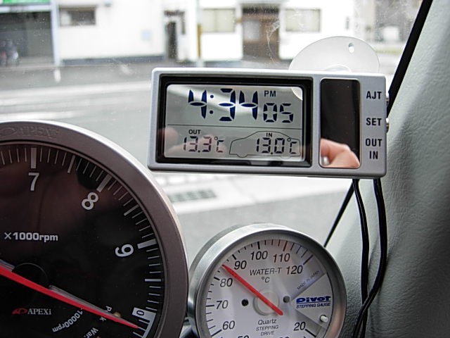 ふらりと買い物に出掛けました。目的地はカー用品店とホームセンター。他にも行きたいお店があるんですが開いてないので諦める。カー用品店でワイパーブレードを購入。次にホームセンターで、圧着端子と自己融着テープを買いに行ったが自己融着テープは無かった。また他のお店に買いに行かないと・・・。はー、車いじるのがドンドン遠ざかるー。帰宅して先日買っていた時計を軽トラに付ける事に。付けると言っても電池式なので簡単。ま、温度計が付いているので車内外に配線するのがちょっと面倒かなーって感じ。で、付いたのがこれ。思った以上に見やすいしシンプル。向こうが透けて見えまーす。でも、バックライトも何もないので夜がどうなるのかって感じ。商品のうたい文句では向こうが透けて見えるので夜はそのおかげで時計が見えるとの事なんですけど・・・。どうなんでしょうねー。そうそう、某中古車店の前に赤信号で止まった時にカローラのフィールダーがあった。カローラバンだよなーと見ていて車の仕様を見ているとなんと6速MTと書いてあった。いいなー、面白そうだなーなんて思ってしまう。で、年式は13年で85万ちょっと高いなーと思う。ていうか、一番の問題はフロント周り。うーん今一買おうという気が出てこないなー。あのカローラのマーク大きすぎ、グリルからボンネットまで膨らんでるし。まだローンがあるから買えないんですけどねー。6速ちょっと乗ってみたいなー。