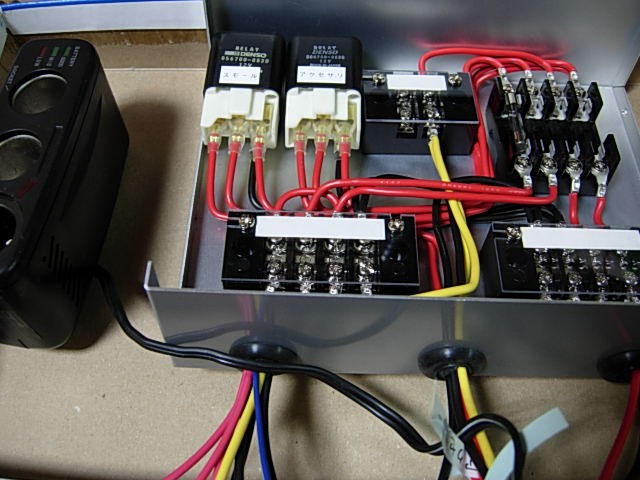 昨日の夜「金田一耕介シリーズ第4弾 悪魔が来りて笛を吹く」を見ながら作りましたー。配線図もなく端子台をなんかを適当に配置しちゃったんで線がゴチャゴチャになっちゃいました。で、配線が綺麗にならないのは配線が柔らかいからなんですー。言い訳ー。とりあえずスモールとACCの二系統の出力が出来るようにしました。でも、スモールなんてそんなに必要ないかも。ま、必要なければACCに回す予定です。配線を切って使い道のない増設用ソケットも組み込みました。この方が見栄えがいいでしょ。リレーはホンダでステップワゴンに乗ってた時に違う目的で購入した物。デンソー製のしっかりした物です。出力はマイナスが4本、常時電源が2本、ACCが3本、スモールが1本て感じです。まだ、増設できまーす。あえてランプも何も付けてません。だって運転席の後ろに付ける予定なので見えないですからね。これで座席の後ろの配線のゴチャゴチャがスッキリします。ほんと見苦しい・・・。昨日も書きましたが、自分でも何が何だか分からないもん。そうそう、「金田一耕介シリーズ第4弾 悪魔が来りて笛を吹く」見ながらというより聞きながらだったんですけど、結構面白かった。現実にあった事件を上手いくドラマに取り入れていると思う。流石横溝正史といった感じ。スマップの稲垣吾郎さんも見慣れてきたし、上手くなってるようにも思える。以前婦警さんを・・・。で、ドラマ全般に言えるんですけどフジテレビが作ると何故か見やすく感じるんですよね。他のチャンネルのドラマは今一に思える。何でなんでしょう。さ、早速リレーボックス付けるかなー。て、天気が今一なのが嫌な感じ。