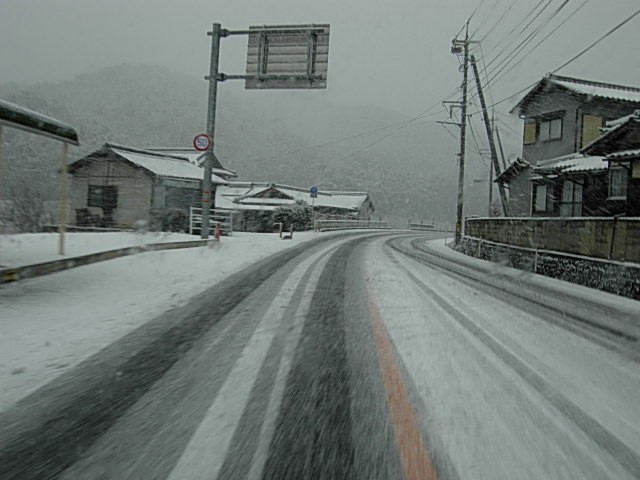 行って来ました雪道。今日は雪が県南でも降りました。おかげで県北まで行かなくても雪がありました。で、これが岡山から湯郷温泉に行く途中にある菊花峠の手前の画像。積もりはじめてます。菊花峠の下り。路面ガチガチになってます。暫く走って車の少ない脇道に入りました。道が狭かったのでマッタリ走って村落に出ました。民家は多いですが静かそう。で、ぐるりと走り行きがけに通った菊花峠を上っていると立ち往生してる車が居ました。夏タイヤの1BOX車とフルキットでオーバーフェンダー付き極太夏タイヤの3ナンバーセダン。1BOXはUターンして下って行っていたが、セダンは上がろうともがいていました。皆右から抜いたので自分も抜きましたー。あとは流れに乗ってノンビリ帰って来ました。昼には無事帰宅。昼からは例のハイエース配線簡素化をやりました。でも、まだ終わらないー。