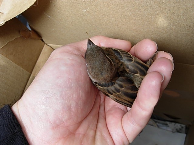 これが昨日別れた雀です。1週間前より大きくなってる気がします。後ろ姿。ずんぐり体形ー。居なくなると寂しいもんです。