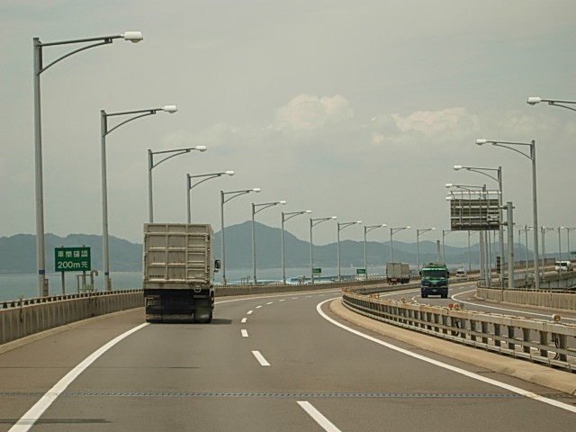 先日高知に行った帰りに撮った瀬戸大橋の画像をアップしたいと思います。坂出インターから暫く走るとこの景色が見えます。右を見ると造船所が見えます。赤の丸いタンクは建造中のLNG運搬船のタンクです。で、もうちょい走るとこの橋脚が見えてきます。上が切れちゃいましたけどデカイです。ちょっと斜めに写ってます。運転しながら撮ってるんでご了承下さい。トラックと比べると橋脚の大きさがどんなのか分かると思います。見通しがいいので気持ちいいでーす。幸い天気が良かったので島も綺麗に見えました。とここで、用が出来たので次回に続くという事にさせて下さい。たいした画像じゃないので期待せずにお待ち下さい。あ、そうそう、たいした画像じゃないんですが、持ち出す方は一言コメントでも残してくれると嬉しいです。
