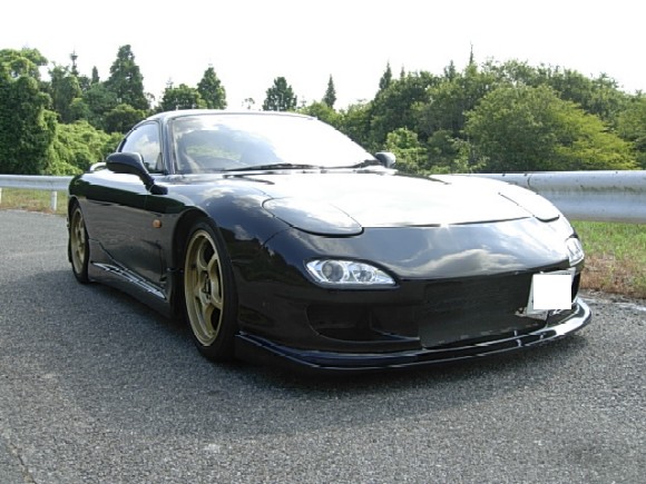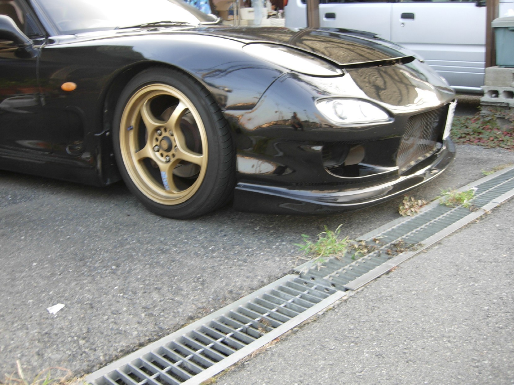 久々の更新~。ついついサボってしまいました。サボってる間にチョロチョロと車を買い換えてました。この度中古でRX-7買いました~。本当はロードスターにロータリーエンジン改装してって近所のいつも御世話になってる車屋の社長に話をしてたんですけど、ベース車から足回り、公認申請等諸々で180万ぐらいかかると言われたんですよね。ダメ元で銀行でローンの申し込みしたら駄目でした。車屋さんの社長に言うと、「低年式の車に高額ローンを組もうとしたらはねられるよ」との事。・・・先に言ってよ。改めて状況を説明して銀行に御願いしたんですけど駄目でした。車屋の社長にいうと、「一度断られたらなかなか通らないからね~」・・・先に言ってよ。とはいえ、ロータリーには乗りたいと思ってたんで社長と話をしてると、「下取りでRX-7があるけど乗ってみる?」とのお言葉。で、運転しました。・・・馬鹿ぐらい走る。いやー、今までミラターボ速くしてどうとか考えてた考えが吹っ飛びました。近所を回って帰って、社長に値段を聞くと「込み40万でどう?」と言われた。ボロいけど車検は一年半以上あるし、エンジンもちょっと音がるけどオーバーホール済み、車高調も入ってキットも付いてコンピュターも変ってる・・・てことで、買っちゃいました。しか~し、乗って帰ると家族からは不評でした。おまけに、会社の入り口に段差があるので乗って行けない・・・。前から見るといかにもって感じ。このフェンダーとタイヤの隙間が好き。乗り降りが大変です。おまけに体形にあってない・・・。所々キットが割れてる。そりゃこんだけ低けりゃ割れるでしょうね。