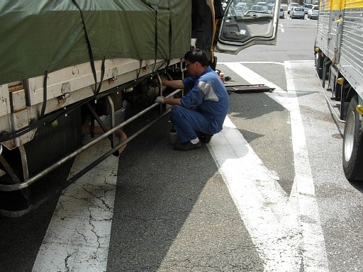 一昨日の深夜、横浜から荷物を積んで福井県の美浜に向かってました。積み荷は、Gメーターなる物が付いてて、前後左右上下の振動を記録紙に記録して基準数値を超えると御持ち帰りさせられるという某会社の製品とんでもない物。大きい奴だと東京で住宅が買えるらしい・・・。一昨日運んだのは小さいので地元で家が買えるかな・・・。運びたくね~。なもんで、気を使うってもんじゃありません。おまけに制約が多い。到着時間から経路、待機場所に至るまで事細か。なかでも一番厄介なのが高速道での速度。80キロ以下、75キロが理想との事。理想はそうでしょうけど、夜の東名、名神走ってみてと言いたくなる。そんな速度で走ってたら、後続車両に追突されかねないですからね。とは言っても数値が基準値超えればタコグラフを提出させられるので守るしかないんですけどね。で、厳しい事を求めて来るのに早く積み込みさせて出発させてくれないから困る。一昨日も昼一番に入って積み込みして出発出来たのが17時過ぎ。東名の横浜町田インターに行くのにあちこち渋滞してて割り込みのとかの普通車に気を付けなきゃならないから神経を使う。やっと高速に上がっても75~80キロの間で走行しなきゃならないからここでも気を付ける羽目に。大型トラックに張り付かれも我慢。普通車に目の前に入られても我慢。ストレス溜まりまくり。そんなこんなで、途中休憩も取りながら名古屋を過ぎ名神に入りました。福井の美浜が目的地なので、米原ジャンクションから北陸道に入るので名古屋まで来るとホッとするんですよね。ひたすら他の車両に迷惑掛けながら走行車線を走ってて、伊吹パーキングエリアの標識が見えた瞬間ボスッって音が。ヤバイバーストしたと思って、ミラーでリヤのタイヤを見たが何も起こってない。フロントも何ともないと思ってたら、急にハンドルがブレはじめて一気に右にハンドルがもっていかれそうになった。右前をやったのかと思いつつ、右にウィンカーを出して路肩に寄せた。ハザードを点けてとりあえず停車した。4トントラックなのでギリギリ路肩内にには入ってるけど、大型トラックが横を走り抜けると怖い。発炎筒を焚いて、三角停止表示板を置かなきゃと思ったんですけど深夜で車両が途切れない。非常電話にも行けれない。仮に公団に連絡しても緊急車両が来るのに時間が掛かる。それに、最近の新聞記事でこういゆ場合追突事故に発展してるのちょくちょく見かける。積み荷も無事に届けたいし、自分も痛い目に遭いたくない。400メーターぐらい先に伊吹パーキングアリアの入り口が見える。選択肢は一つ。ホイールやブレーキホースがどうなってもいいから前進あるのみ。いざ走り出すとかなりの振動。スピード上げて早く行きたいけど、積み荷に振動与える訳にはいかない。突っ込んでくるなよと思いながらミラーを見てると、すぐ横を邪魔だとばかりにハイビームで大型トラックが通過していく。下手な怪談話なんて目じゃないぐらいの恐怖。早く行きたい、でも振動与えちゃ駄目のジレンマに襲われながらなんとかサービスエリアに逃げ込めました。ホッとしつつ会社に連絡入れて業者を手配しました。心臓に悪いったらありゃしない。1時間程して業者の人が来てタイヤを交換してくれました。が、やはりブレーキの配管を傷めてるとのことで、さすがにブレーキの配管は持ってないのでメーカーに手配しての事になりましすと言われた。ま、今更焦っても仕方ないので開き直って寝ちゃいました。翌朝、メーカーから連絡があるって言われてたんですけど、全然なくてこっちから電話しても繋がらない状態。ちょっと不安になったけど、ま、どうしようもないわと開き直ってモバゲーやってると、「修理に来ました」とツナギを着た人がいきなり来て焦った。どのくらい掛かるか尋ねると、「何もなければ30分ぐらいです」と言われたので、会社にその旨伝えて先方に連絡してくれるように頼んだ。トラックなのでキャビンを上げると簡単に交換出来るので30分も掛からず終わった。整備をされてるとはいえ、手際がいい~。その後、荷降ろし先に到着して振動をチェックしてもらって問題かったので無事に荷を降ろして終了~。やっぱりタイヤは車を支えてる最終の部分だからいい物使わないと駄目ですね。このバーストしたタイヤも2002製だから古すぎだし、サイドに傷とか付いてたら交換しなきゃ危ないわ。会社もお金の掛かる事なんで、事前に言ってもなかなか交換してくれませんけどね。今回みたいな事になったら余計な出費になると思うんですけどね。変わり果てたお姿になりました。