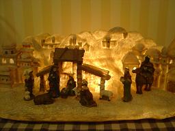 下駄箱の上にキリストの誕生の人形を飾りました。 中にライトが内蔵されていて、…