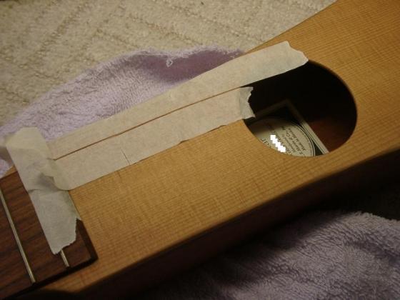 アコギのトップ面の割れを修理取り掛かりました。このアコギは普通のアコギじゃないためにホール部分に手が入りません・・・・(-ω-;)ウーン普通の工程は内側から接着してからトップ修正になるのですが、このアコギの場合は逆の順の工程でやります。まず、ボンドを塗るために割れた部分の周りを最低限にギリギリにマーキングします。細長のアコギだったために、万力で噛ますことが可能でした!割れて広がっているために、元に戻すにはこの方法しか、浮かばなかった・・・・割れた部分をボンド塗ります。合わせ面を見ながら緊張に万力を回します。力の加減を失敗するとトップが歪んでしまうので、本当に神経使います・・・・・一応、仮接着なので割れた部分をボンドで盛ります。少し、乾いたらマーキングテープを剥がします。そうすると綺麗に接着しています。これで終わったわけではありません。次は内側の割れた部分にに接着しなければいけません。どのように修理するか、考え中です・・・・_| ̄|○ ガクッ・・・