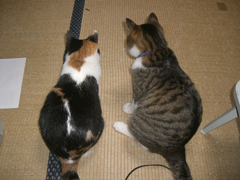 3連休は予定通り実家へ帰省。猫たちは正月よりも一回り大きくなっていました。それでもやっぱり可愛い実家の猫たち。子供も「かわいい~」と、1mくらい離れた所から言ってました。(←少し怖いみたい)そんな娘も最後の方には慣れてきたのか、猫の背中をなでなでしてました。そしてあっという間に終わった3連休・・・。自宅に帰り、黒のジャケットに猫の毛がいっぱい着いていることに気付きました。ココア&小次郎の毛だと思うと、なんだか尊くなりましたが、やっぱり汚いのでコロコロで全て除去しました。(笑)▼猫たちの写真です。(1)ココア&小次郎、虫を見つめる(2)ココア、入室(3)小次郎、入室(4)ココア、左から出てくる(5)小次郎、ひもが何かにひっかかる(6)ココア&小次郎、基本仲良し