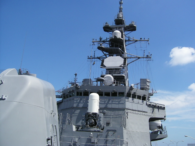 補給艦「ときわ」が大きいためか、となりの護衛艦「たかなみ」は、まるでスーパーモデルのように細身に感じてしまう。それでもやっぱり護衛艦だけのことがあって、向かい側に係留されている南極観測船から眺めると、護衛艦ならではのガツガツした構造物が見てとれる。艦橋から艦尾にかけて、とても一枚に収まらない程大きい!後ろ斜めに伸びたアンテナが格好付けている。相模湾で「ゴジラ」の捜索に活躍したと云うのは東宝映画での話だが、国内外で忙しく働いている艦である。一例を挙げれば、はるかトルコからやってきた艦艇のホストシップとしての仕事もこなした。 →詳しい写真はこちらから