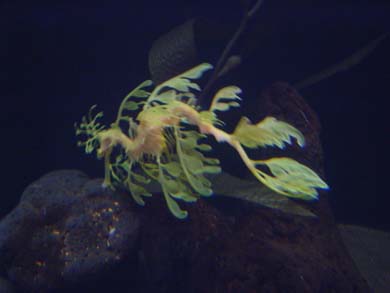 癒しのホノルル動物園に続く、癒しのワイキキ水族館で私は世にもめずらしい生物に出会った。タツノオトシゴの一種で、たしかSEADRAGONと書かれていたと思う。彼(彼女?)の体は、海草にしか見えない。けれど、その”なんちゃってワカメ”とでもいうべき半透明の体をヒラヒラさせながらゆったりと泳ぐ姿は、とても優雅だ。なぜかすごく知能が高いような、何かを考えているような風貌に思え私はしばらくこの生物が水の中を漂うのを、ぼーっと眺めていた。そして、今回の2番目のお気に入りが、このクラゲたちである。これは、もうこの写真の何倍もキレイな色で、何倍もかわいい。彼らはゆったりと動くのではなく、キュッキュッという感じで動く。(故にブレている・・)動画でお見せできないのが、本当に残念だ。(今思いついたのだけれど、イカの泳ぎ方に似てるかも・・)まるで童話に出てくる赤と白のキノコの、ブルー版という感じの水玉模様。あまりのかわいさに、私は本気で飼えないものだろうかと考えたほどだ。何年か前に、その鮮やかな蛍光色と、半漁人のような顔、そして魚に足が生えて岩につかまっているような、グロテスクな容貌で私の目を釘付けにしたフロッグ・フィッシュは、もういなかった。死んじゃったのかな・・それにしても海の中には、なんていろいろな生物がいるのだろう。珊瑚やイソギンチャクも、みんな生きて動いている。ダイビングをしない私が、海の神秘を少しでも目で見て感じるにはここ、ワイキキ水族館へ来るしかないのだ。新しくできた縦に長い円形のクラゲの水槽の前には、ベンチが置いてあり、そこに座って呆けたように、水中を漂う大小のクラゲを眺めている人が・・他人事ながら、”あの人、無事にこっちに帰ってこられるだろうか”と心配になったりして・・水族館が動物園よりいい点は、まず涼しく、日に焼けないこと。歩きすぎて足が痛くなることも、道に迷うこともないこと。匂いがしないこと。さらに、各生物の解説が水槽ごとに日本語で録音されている、細長い携帯電話のようなものも貸し出してくれる。暗い水族館の中から外に出ると、木々の向こうにカピオラニ・ビーチ、そして反対側にはダイヤモンド・ヘッド。この水族館のロケーションも最高だ。そしてその後、私達は神秘の海の中の世界から、チャイナタウンの飲茶という、まるで正反対の世界へワープしたのだった。★チャイナタウンの飲茶は、相変わらずの喧騒。 ほとんど怒鳴りあっているかのような人々の中で、 人間もみんな一生懸命生きているんだ・・と、違う意味で感動しました(笑)