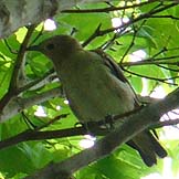 たまには独りでお散歩に出かけることもある。半ば私物化している Lumix DMC-LZ2 はもちろんウェストポーチの中だ。 鳥さんにはあまり出会えないだろうな、と期待せずに、いつものルートを辿り始めた矢先、コカワラヒワによく出会うポイントで青々とした木々を見上げてみれば、パタパタと動く影。ご存知、コムクちゃん。 オシリがラブリー。 むろん、ポタッと、お土産なんかを落としやがったら、ラブリーなんて騒ぎじゃねぇが。 で、このコムクちゃんがパタパタと他の木に移ったのと入れ替わりに登場したのが、こちら。よく判らなかったが、ヒヨちゃんくさいヤツ。 落ち着きのなさはコムクちゃん以上。 胸の模様の斑は、「ゴマシオだなぁ」と視認できるくらい。 プルプルしたかと思えば、パタパタして、あっちゅう間に、コムクちゃんの後を追いかけて他の木に移っちゃった。 その後は、フレームに収めることはかなわなかったものの、くぐもった声で鳴きながら木から飛び立つ灰色っぽい鳥さんグループに 2度ほど遭遇。 中々に充実したお散歩であった。