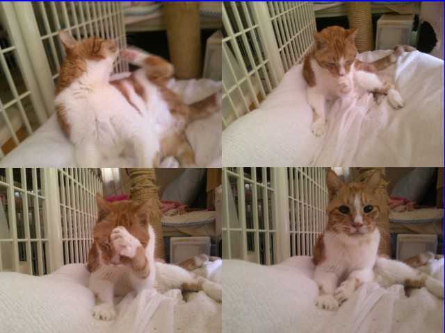 はっちゃく(18)はフェイスクッションの上で毛づくろい中