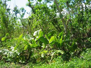 大人の頭より大きい、巨大な団扇の様な葉の植物が繁っています。
