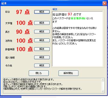 私が読んでいるサイトITmedia:エンタープライズに載っていた記事にパスワードを取り上げた物がありました(^^)ちょっと面白いので会社のパソコンのパスワードを入力してみましたが結果は、75点でした(^^;)文字長が50点という低さで足を引っ張っているのでした。Password Evaluation Soft (http://fapsis.s1.xrea.com/paseva.shtml)そこでITmediaの通りにやってみました おぉ!なかなか良い点をもらえました。Boss検知とか面白そうですね。しかし、会社のパソには、カメラ付いてないので使えません。(^^;)