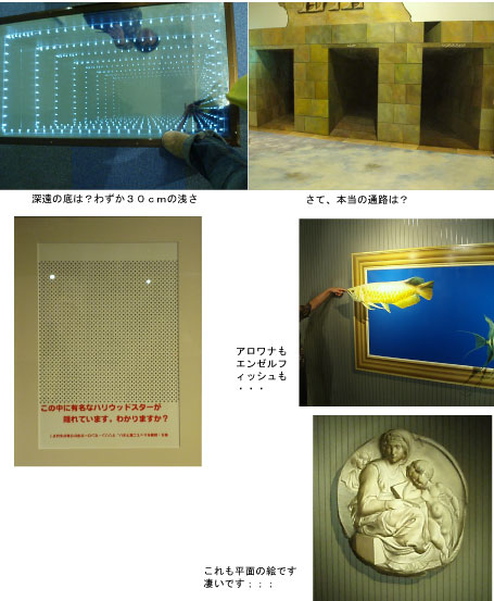 以前の連休のある1日、高尾山にあるトリックアートに行きました。トリックアートミュージアムは、数あるようですが私は、まだここしか知りません。ここのテーマは、エジプトの遺跡です。あまり大きなところではないのですが、テーマも含めて私は、ここが結構好きです。人間が絵に手を添える事で更に立体感を増すトリックアート。ここは、人が一緒に楽しめるミュージアムです(^^)(本当は、それなりに写真も撮ったのですが、私の姿を晒すにはおなかがぷっくりし過ぎで恥ずかしいので出せません;;;おほほほほ)写真は、本当に一部分ですが楽しんで下さい。