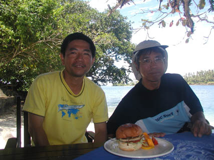 ダイビングショップはアクアベンチャーです。ジェイスアーベンリゾート内にあり、オーストラリア人夫妻により経営されているようです。(オーナーなのか、どうかは知りませんが。。。)1日3ボート+セルフフリーが基本パターンかな?午前2本潜り、ランチはリゾートに戻ります。ダイビングショップ横にバーがあり、ランチタイムにやってるレストランはここだけです。(朝夕はレセプション前のレストランのみ、、、) 初日に食べたチキンバーガーです。 でっかいです。ビッグマックもびっくりです。絶対、口に入りません。。。味がとびきり良いわけでもないのに高いんです。。。パプアニューギニア、物価高すぎです。。。このバーガーが20キナ(1キナ=約45円)もするんですよ。。。リゾートって言っても全然大したホテルじゃないのに。。。残り5日のうち、2日は町の中華レストランへ。3日間は、卵サンドをたべてました。 これで、750円くらいかな。。。でも、まあ、これは食べられました。面白いのは、3日続けて卵サンドを食べたんですが、はさんである卵が毎日、変わってました。卵焼きゆで卵目玉焼きって感じで。メニュー思いっきり少ないからこれで、バリエーション出してるのかな?デザートに、アイスを食べたこともあります。アイスはまあ、安い方です。 これで5キナ=約250円3人で1個ずつ頂きました。でも、待てよ。私らおじさんは1個で充分すぎる大きさで、何の疑いもなく、1個ずつにしましたが、もしかして、mayukaさんは一人で全部食べたかったかも???味はなつかしい素朴な感じのアイスでした。食べるもんは。。。ですが、景色は素朴で鳥の声だけが聞こえる静かなぼ~っとしてるとなんか、幸せな気分になる良いランチバーでした。