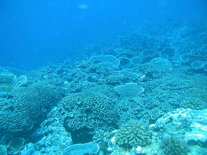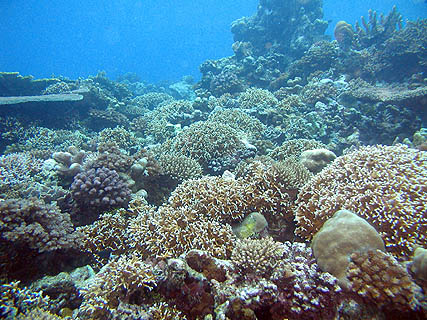 パプアニューギニアは珊瑚がきれいでした~。珊瑚海って、名前の海があるようですが、その名の通りです。ダイビングポイントで他のボートと一緒になったことはおろか、見かけたことさえ、有りません。。。ダイバーが少なく荒れていない感じです。大物を見かけなくてもこの珊瑚で充分、満足できました~。 ガイドのリチャードです。 珊瑚の生存競争もけっこう激しいのかな??