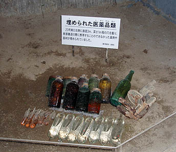 南風原文化センターへ行くと、壕に入れますとのこと。予約していなかったんですが、ラッキーなことに、40分後くらいに予約されている方が居られて便乗させてもらえました~!南風原陸軍病院壕は手掘りのトンネル30本(ひめゆり資料館では40本と話されてましたが、記憶違いかな?)ほどあったようです。そのうちの1本が整備され、見学できるようになっています。案内のボランティア?の方も居られ、説明して下さいました。入ってすぐに掘り出された当時の薬が置かれていました。中の薬は当時のままだそうです。 戦後、鉄クギなどを拾い集めていた子供らが見つけて、何だろう?と思い、飲んで亡くなったケースもあったそうです。米軍が攻めてきて南部撤退の際、歩けない重傷患者には青酸カリなどがミルクに混ぜられて配られ自決を求められたようです。少年が飲んだのも、そういった毒薬の類だったのかも知れません。壕内には、右側か左側に木造の2段ベッド(南風原文化センターにジオラマがありました)があり、1段に2人ずつ寝かされていたそうです。ひめゆり学徒の人達は眠る場所もなく、立ったまま壁にもたれて、1,2時間寝たくらいだったそうです。 壕内の壁や天井には米軍の火炎放射器により、変色したあとが見えます。 トンネルを支えていた柱も火炎放射器により、炭になっていました。食事は、1日にピン球くらいの大きさのおにぎりが1,2個で、ひめゆりの人達には当たらなかったこともあったそうです。また、米軍が攻めてくる前の段階からすでに食料は野球ボールくらいのおにぎりが2個くらいだったそうです。。。はじめから、食料もなしに徹底抗戦だったんですね。。。トンネルの中程の天井に名前が刻まれていました。 わかりますか?63年経って、かなり薄くなっているようですが、姜 と3つほど刻まれています。証言により、このあたりのベッドに朝鮮人軍属?軍人??が居たことまでは分かっているそうですが、彼の本名が姜なのか、彼が刻んだものなのかはわかっていません。長野の松代大本営の映画「キムの十字架」を思い出しました。病院壕の見学は20分程度ってことでしたが、あれこれ、質問したり、話させてもらってるうちに1時間ほどが過ぎていきました。やっぱり、こうやって説明して頂いたりすると勉強にもなるし、楽しいです。やっぱり、人と会うってのは、楽しいですね。入口前には憲法9条の碑がありました。 今、沖縄に6つあるそうです。大阪にもあるのかな??隣の鎮魂と平和之鐘がありました。私も、鳴らしてきました。