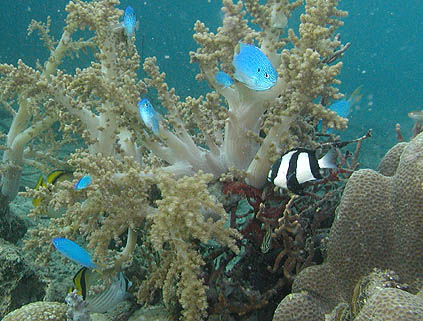 バラクーダポイントには4回潜りました。その2回目です。バラクーダは少しでした。上の写真はナンヨウツバメウオとギンガメです。 ここ(コーナーになるのかな??)の浅場にはいつも有る程度のギンガメは群れているようです。ギンガメは居ましたが、大物については3本目のバラクーダポイントが良かったので、今回は、珊瑚を! もちろん、きれいな魚たちもいっぱいです。 セグロチョウチョウウオ レモンチョウチョウウオ左はヒレナガハギ前にも書きましたが、私が潜った中では珊瑚は一番です!