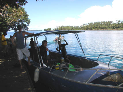 写真は4日目サーフタイム無人島につけたボート上です。左がガイドのリチャード右がボートマンのアルバート(?)です。ジェイスアーベンリゾート内にあるダイビングショップがアクアベンチャーです。アクアベンチャーでは前日や朝にその日の動きを確認します。2本潜るのか。3本潜るのか。は当然として、それ以外に夕食はどうしたいとか、町へ散歩に行きたいやら、島の村へ行きたいなどほとんどありとあらゆるリクエストに答えてくれます。(今回はゲストが少なかったからだと思いますが、 少なくてもかなり答えてくれようとするだろうことは 間違いがないと思います。)中でも、びっくりしたのは、他のゲストが午前中2本潜る時に、私だけ、ボートは1本で、もう1本はハウスリーフセルフをしたいんですが。。。と最終日に、恐る恐る言ってみるとこともなげに、OK!しかしながら、大変なのはボートマンのアルバートです。上記のケースでは1本目が終わって、無人島に他のゲストをおろし、私をリゾートまで(約20分?)送り、またポイント(無人島)まで戻っていったり、ようやく、ダイビングから戻ったと思ったら、島へ連れて行ってくれたり。その島や、レストランなどでは、私達の帰りまで、待ってて呉れます。町の散歩の時には、行きはボート、帰りは町のスーパーで待ち合わせ、車で送迎(さすがに車の運転はアルバートではなかった)と言うことで、この2人にはとてもお世話になりました。ありがとう~~。そして、私らのさまざまな希望をことこどく伝えてくれたのが、mayukaさんでして、ほんまに助かりましたわ。ありがとう~。