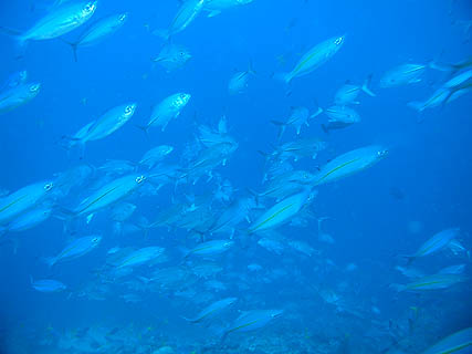 3回目のバラクーダポイントでした。きれいな珊瑚を眺めながら、アデヤッコ、アカククリ、イナズマヤッコアカネハナダイ、クマノミなんかを見ながら流していると、いつものコーナー??付近まで来ました。 ギンガメアジ登場です~。サメを追っ払ってます~。 一番はじめにアップした写真です。 イエローフィンバラクーダです。 数は少なかったですが、ブラックフィンはギンガメと渦巻きかけていました~。