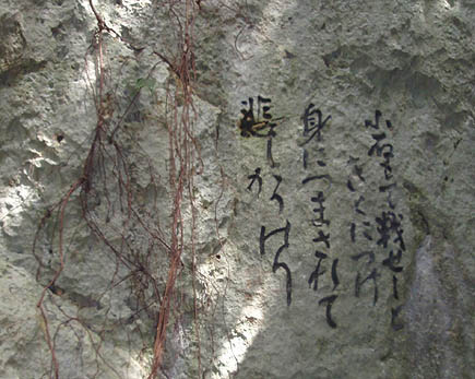 沖縄戦では、全員が死ぬまで戦うということで、これは沖縄に限らず、日本全国のことだったようです。沖縄戦は、本土決戦のモデルとされていたそうですが、当時の首脳は、本気で1億玉砕を考えていたのかな??もし、米軍が九州など本土に上陸してくれば、そこでも同じことが起こったのかも知れません。。。とにかく、沖縄では中学生は全員、軍人軍属として動員されたようです。女子はひめゆり学徒隊が有名です(学校ごとに学徒隊をつくったので、他にもずゐせん隊・白梅隊など たくさんあります。ひめゆりは県立一高女と女子師範の隊です。)男子は鉄血勤皇隊として、動員され、健児の塔は、沖縄師範(今の教育大)の学生による隊の慰霊碑です。慰霊碑の地下には当時の日本軍が使用したガマがあります。このガマに潜みながら、抵抗を続け、中学生(今の高校生)は伝令や水汲み爆雷を背負って自爆攻撃に出されたりもあったようです。ガマの出口のがけに詩がきざまれています。