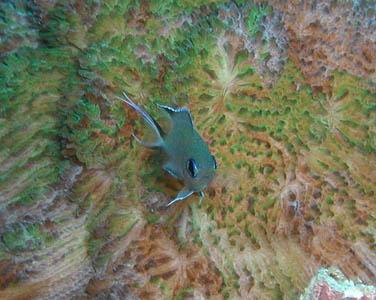 名前は自信ゼロです。。。このお魚、なかなかすごいです。あるところに行くと、いっぱい居て、巣があるのか?ピュ~っと突撃してくるんです。すごかったです。その場所には、けっこうたくさん居てピュ~!とやって来るのは1匹ではありません。。。おえおえ~おまえもか?ってくらい突撃を喰らいました。。。最初はビックリして、おえおえ~(やめて呉れよ~)と思いながらもわかったわかったと退散してたんですが、ハウスリーフには7回も潜ったので、だんだん、慣れてきてしまいに、ピュ~攻撃?を逆手に取って写してみました~! なかなか、ピントが合ってくれませんでしたが。。。 けっこう面白かったですが、あんまりおちょくるのも、魚に悪いのでやっぱり、早々に退散してきました。。。