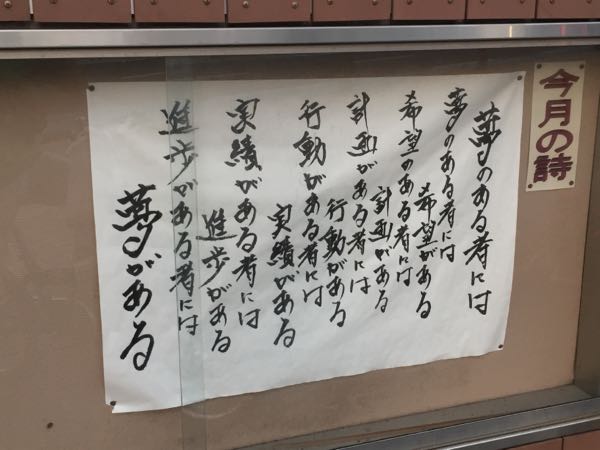 実家滞在日は終日母親の付き添いヘルプを。井筒屋美味いもん市、リバーウォーク北九州内にできた八百屋 植木商店、レガネット、室町の花屋等。買いもの難民状態だった周囲の環境が随分と改善されたのはありがたい♪ 一人自転車で外出したついでに、出身の小中学校近くまで。思永(しえい)中学の校門前には、かつてはなかった教訓掲示板みたいなものが。以下、今月の詩を引用してご紹介。夢のある者には夢のある者には 希望がある希望のある者には計画がある計画がある者には行動がある行動がある者には実績がある実績がある者には進歩がある進歩がある者には夢があるWritten by 人力車の博多人力屋 以下のリンクをクリックして下さると、一票投票されて人気blogランキングに反映されるシステムになっています(一日一票)。毎日更新の励みになります。→人気blogランキング<起業・独立部門> ご支援クリックいつもありがとうございます!ただいま49位に。