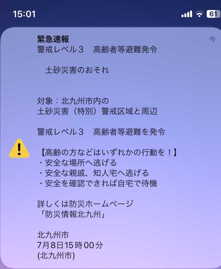 ※滞在している小倉でも夕方に警戒レベル3の緊急速報あり、携帯から大音量の警報が。梅雨末期の豪雨、大きな災害が起きませんように。
