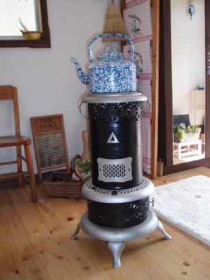 このストーブはなぜだか・・バイク屋さんで買いました。このお店のオーナーさんが個人的にストーブが好きで、アラジンのストーブとかたくさん置いてあります。私が買ったストーブは1930年代のアメリカのストーブです。おもしろいことに下の方に OIL HEATER と書いてあります。70年以上も前のストーブですが、バイク屋さんがしっかりと手直ししているので、今でもちゃんと使えます。旦那にはストーブの値段は教えていません(ごめんなさい!とここで謝る悪妻)。上に乗っているアンティークのヤカンはオークションで千円でした。旦那とストーブの話をするときは、「ヤカンがとっても安かったのよね~」と話をそらす妻なのでありました(笑)。