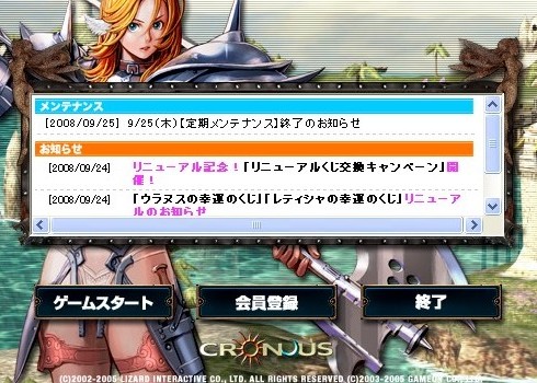 絶好調の超不定期更新。書く気が無いだろ馬鹿野郎とな?バレバレだが問題ない。夕方頃久しぶりに山さんと色々と話したりしました。クロノスはもう随分と触ってなくて脳みその記憶のタンスでもかなり奥の方のタンスでゴン臭漂う事間違いないくらい隅っこの記憶でパラディンについて色々と話しました。マスターになったとか数値はどのくらいだとかスキルは~とか、こういった事をお互いに色々と話あっている間が実は一番楽しいんじゃないかとプレイしてた当時も良く思ってました。そんな一番のパラディン仲間の影響もあり「良し久々にやってみようか!」と何百日振りに思いあのexeを起動する事に いやー実に懐かしい場面だ。自分でも良くアンインスコしてなかったと思うよ出てくる日付は1年と約2ヶ月前。そういえば前回の起動もこのくらい期間を空けてた様な・・・気合いを入れてYESをクリック 眠らない大陸クロノス! ∧∧ ∩ ( ´∀`)/ ∧∧ ∩⊂ ノ ( ´∀`)/ (つ ノ ⊂ ノ ∧∧ ∩ (ノ (つ ノ ( ´∀`)/ (ノ ⊂ ノ (つ ノ ∧∧ ∩ (ノ ( ´∀`)/ _| つ/ヽ-、_ / └-(____/  ̄ ̄ ̄ ̄ ̄ ̄ ̄ <⌒/ヽ-、___ /<_/____/笑いのわかる素晴らしいexeでした。しばらく放置すると自己学習する機能が付いていた様です。今やってるゲームの事とかはまた気が向いたら別に日に書こうと思います。